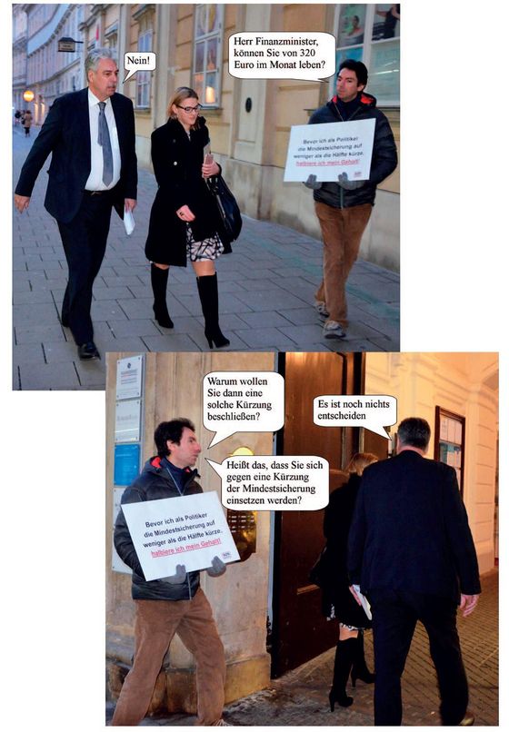 Darüber hinaus habe ich verantwortliche PolitikerInnen wie Finanzminister Hans- Jörg Schelling, Vizekanzler Reinhold Mitterlehner, Integrationsminister Sebastian Kurz, ÖVP-Klubobmann Reinhold Lopatka, Ex-Innenministerin Johanna Mikl-Leitner und den niederösterreichischen Landeshauptmann Erwin Pröll direkt mit der Sozialfrage konfrontiert. Mit dem Schild – „Bevor ich als Politiker die Mindestsicherung auf weniger als die Hälfte kürze, halbiere ich mein Gehalt.“ – will ich sagen: Ein Politiker, der auch nur ein wenig Anstand besitzt, muss alles dafür tun, um zu verhindern, dass bei denjenigen gekürzt wird, die am Wenigsten haben. Zuerst wurde eine Kürzung auf 320 Euro im Monat für Asylberechtigte diskutiert, später maximal 520 Euro. Mit diesen Beträgen habe ich die PolitikerInnen konfrontiert. Mein Eindruck: Schelling, Pröll, Kurz, Mitterlehner und viele andere machen sich schon sehr lange keine Gedanken mehr darüber, was es heißt, von einigen hundert Euro im Monat zu leben. Mitterlehner verdient zum Beispiel 733 Euro brutto – am Tag. Ich will ihm nichts wegnehmen. Aber ich finde es nicht gut, wenn jemand, der so viel an nur einem Tag verdient, leichtfertig über Menschen regiert, die vom gleichen Betrag nahezu ein ganzes Monat leben müssen.